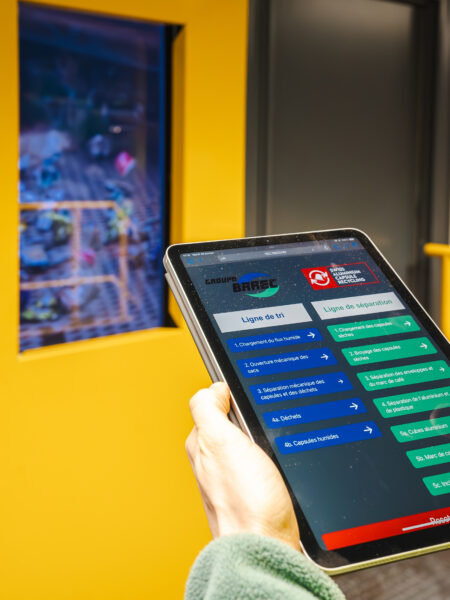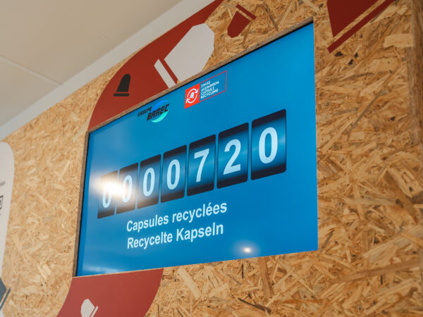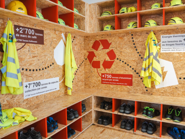 Nous avons conçu le concept graphique et la scénographie de l’espace d’accueil de l’usine de recyclage de capsules Nespresso à Moudon, en Suisse.