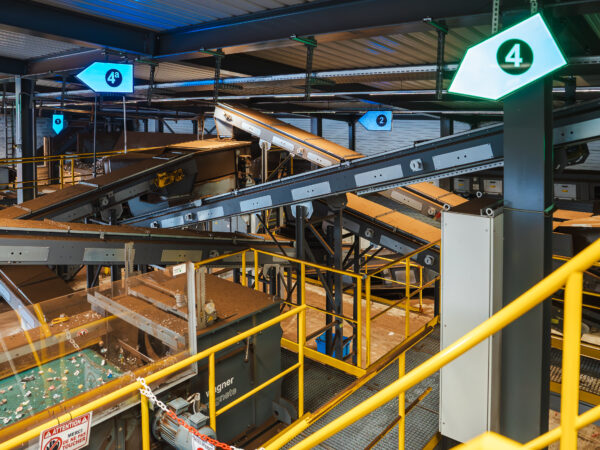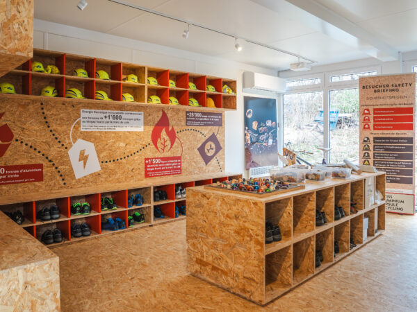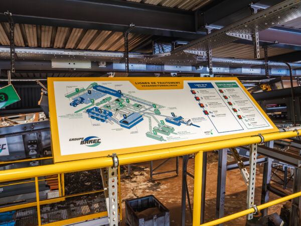 Le projet comprenait la conception et la réalisation de l’ensemble de l’espace d’accueil, ainsi que la signalétique de l’usine, soigneusement conçue pour orienter les visiteur·euses et expliquer de façon claire et pédagogique les différentes étapes du processus de recyclage.